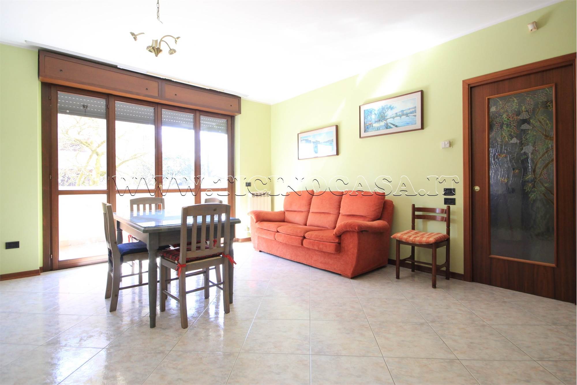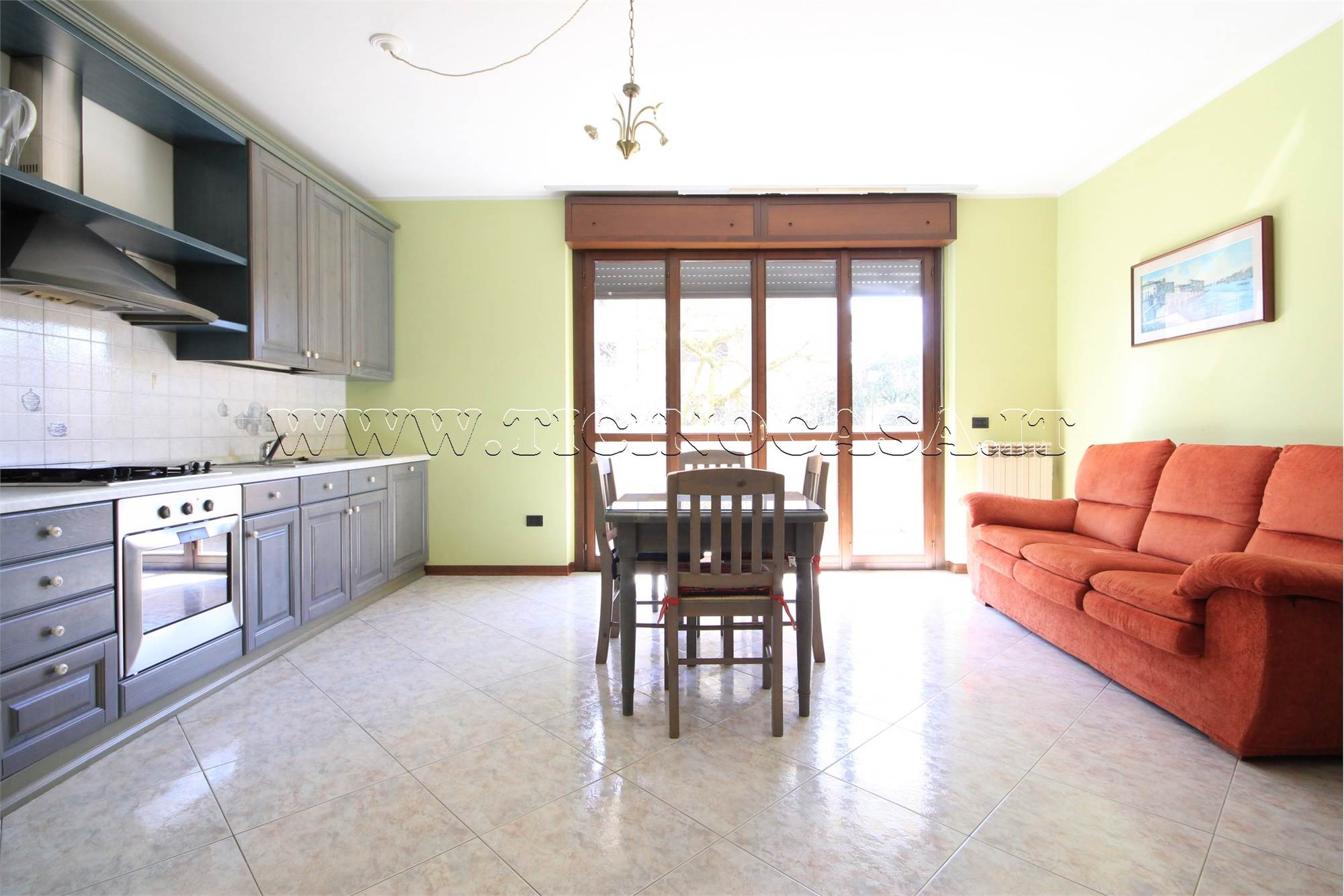 Ingresso (con portoncino blindato) direttamente nella generosa zona giorno ove la cucina è mantenuta a vista. L'ambiente è reso molto luminoso grazie all'ampia vetrata in uscita sul primo dei terrazzini e alla favorevole esposizione sud.